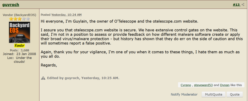 Just letting you know that when I have Malwarebytes real time protection active, I'm getting a website blocked due to riskware warning when I try to access the O'Telescope website. I added the IP address of the site to the exclusion list to be able to post this message. Any idea what the issue is?