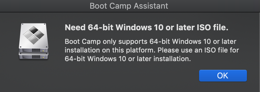 I downloaded the 32 bit ISO of Windows 10 and tried to install it using the Boot Camp assistant, and learned that it's not possible to install 32 bit Windows on MacOS Mojave. MacOS Mojave only supports Windows 10 64 bit: