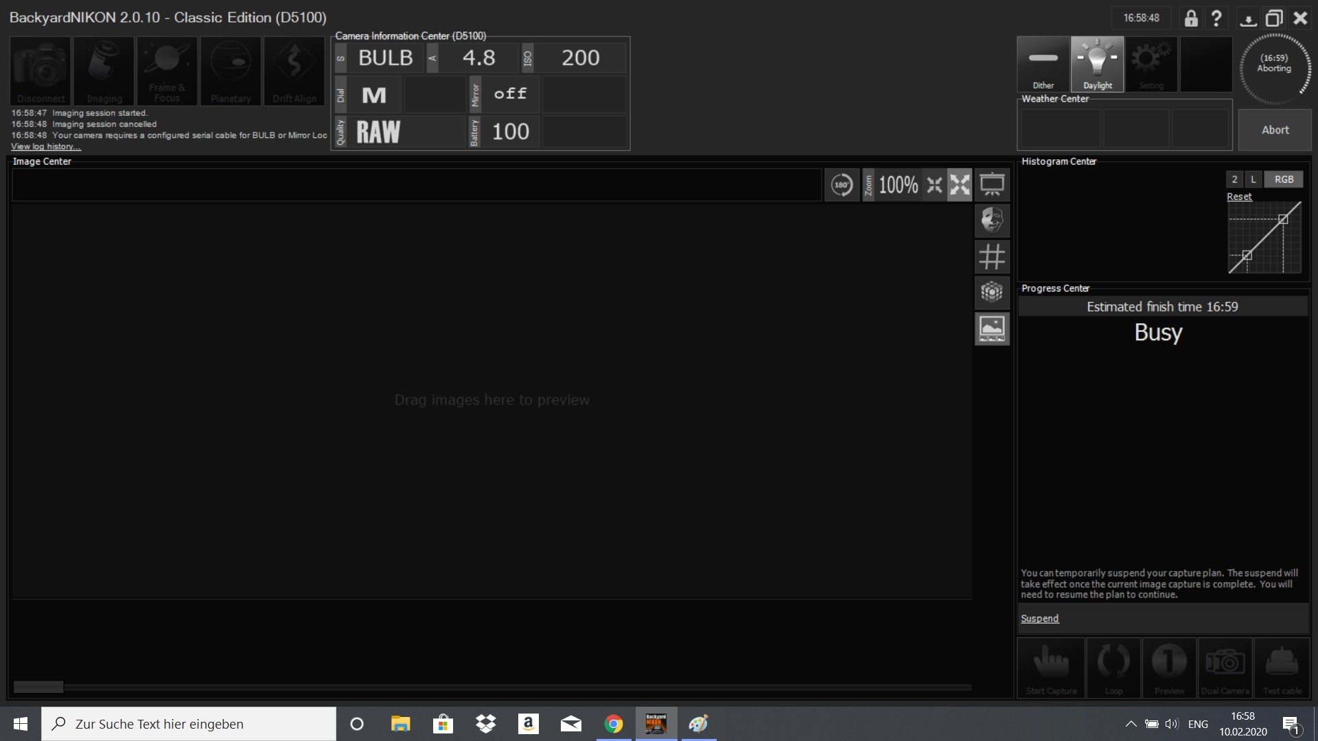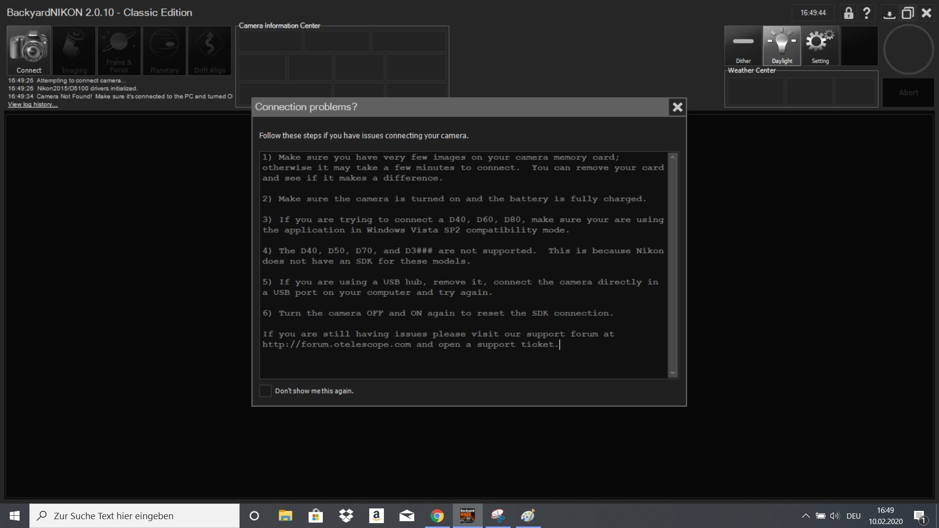 I tried connecting my Nikon d5100 in backyardnikon. I used DSUSB (came today) and it doesn`t work. It writes camera not found (pic Nr.1). If I connect the camera directly to the USB port it works (pic. Nr.2), but I can not do loger expesure ten 30 sec.
