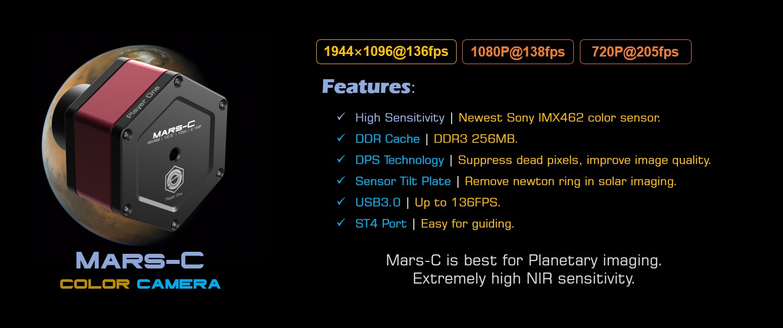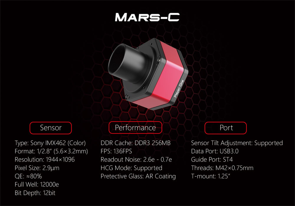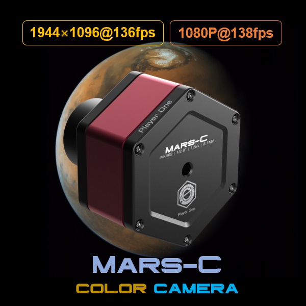 Mars-C is a planetary camera developed by Player One Astronomy, which adopts the Sony IMX462 1/2.8” format sensor. The 2.9um pixel size accommodates a well depth of 12ke with a total of 2.1MP (the resolution is 1944*1096), and the diagonal is 6.46 mm.