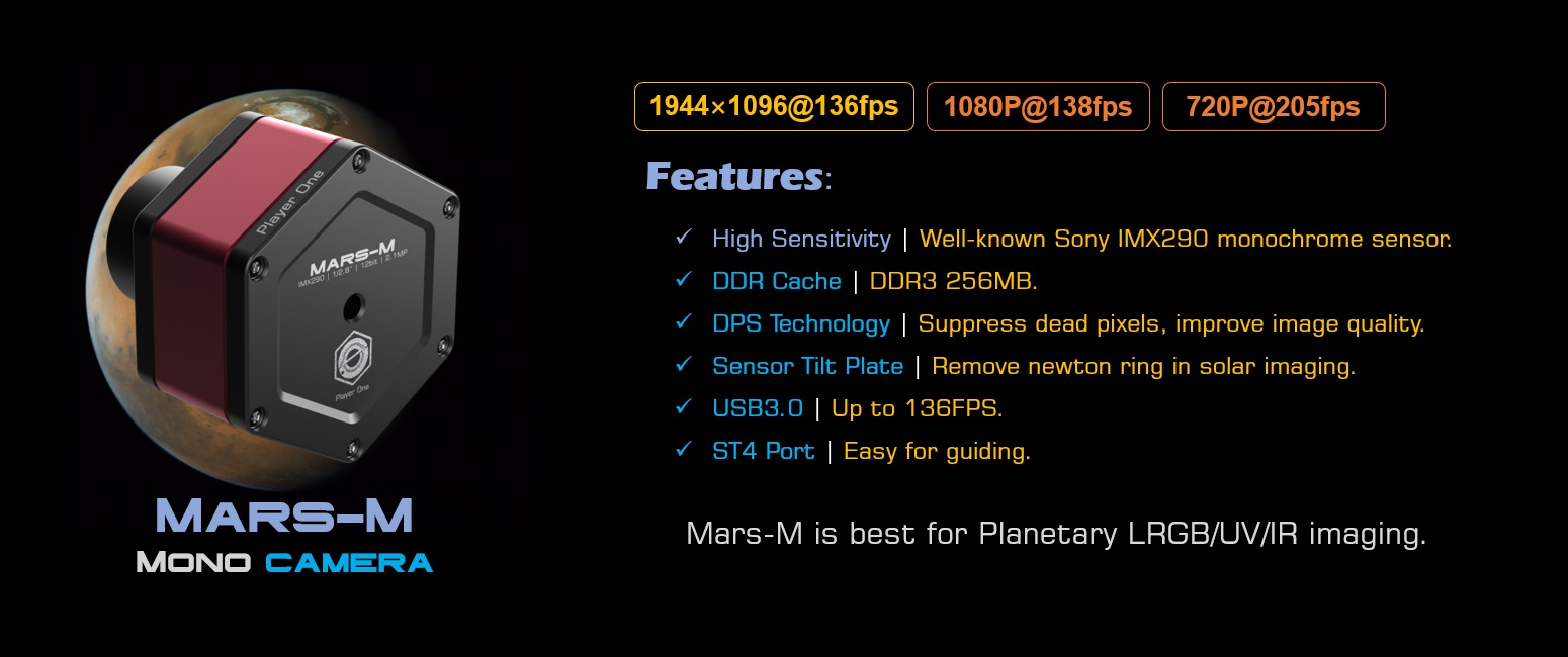 Mars-M is a monochrome planetary camera developed by Player One Astronomy, which adopts the Sony IMX290 1/2.8″ CMOS , with a 1944 x 1096 array of 2.9um pixels and the diagonal is 6.46 mm.