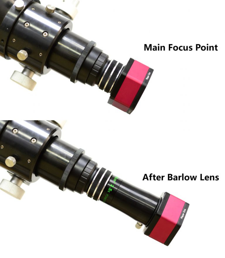 Connecting the Mars-M camera to a telescope with an 1.25″ T-Mount, or adding a Barlow lens between the camera and a telescope to extend the focal length for more details.