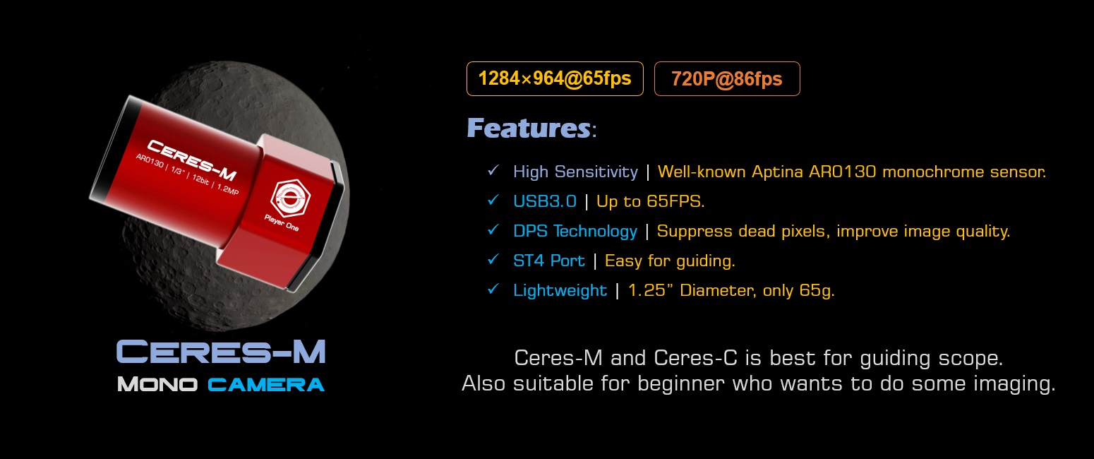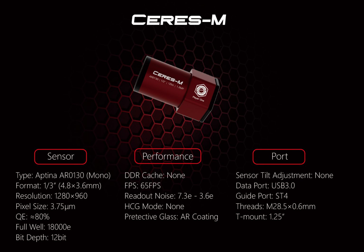 Ceres-M USB3.0 Mono Camera (AR0130)Player One Astronomy guiding camera series, AKA Dwarf Planet Series, is design for guiding and imaging. This series including 3 sub-series, Ceres, Sedna and Xena.