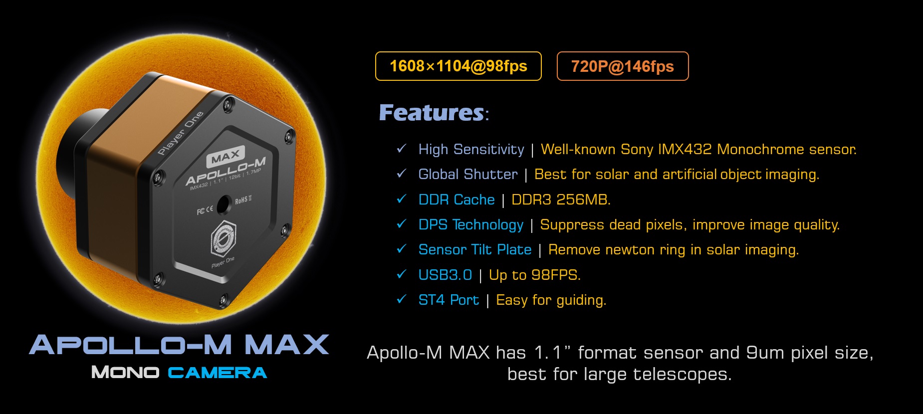 Apollo-M MAX is a solar camera developed by Player One Astronomy, which adopts the Sony IMX432 1.1” format monochrome sensor. The 9um pixel size accommodates a well depth of 100ke with a total of 1.7MP (the resolution is 1608*1104), and the diagonal is 17.5mm. monochrome sensors.