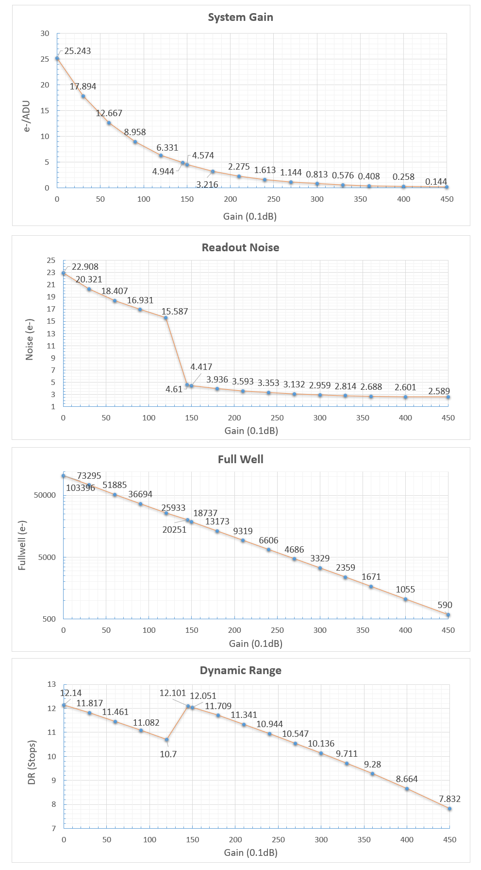 At 380 gain, readout noise of IMX432 is 2.6e, it is lower than IMX174. And full well will still bigger than IMX174.