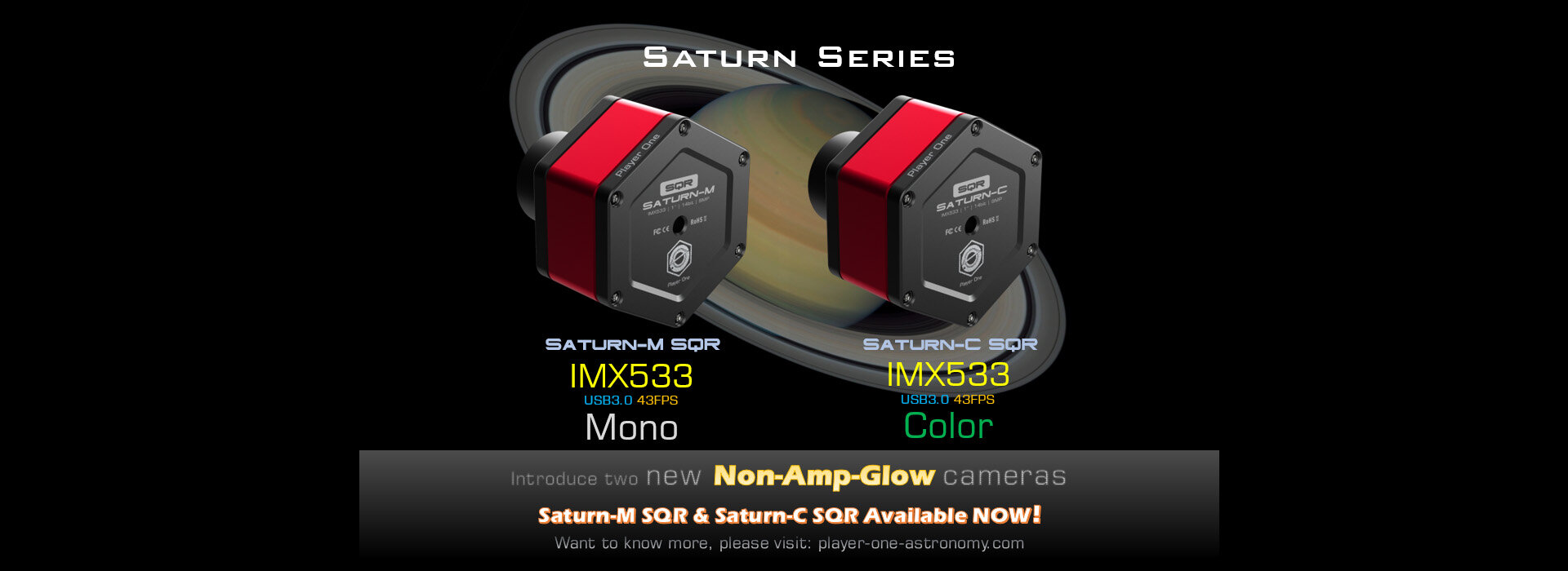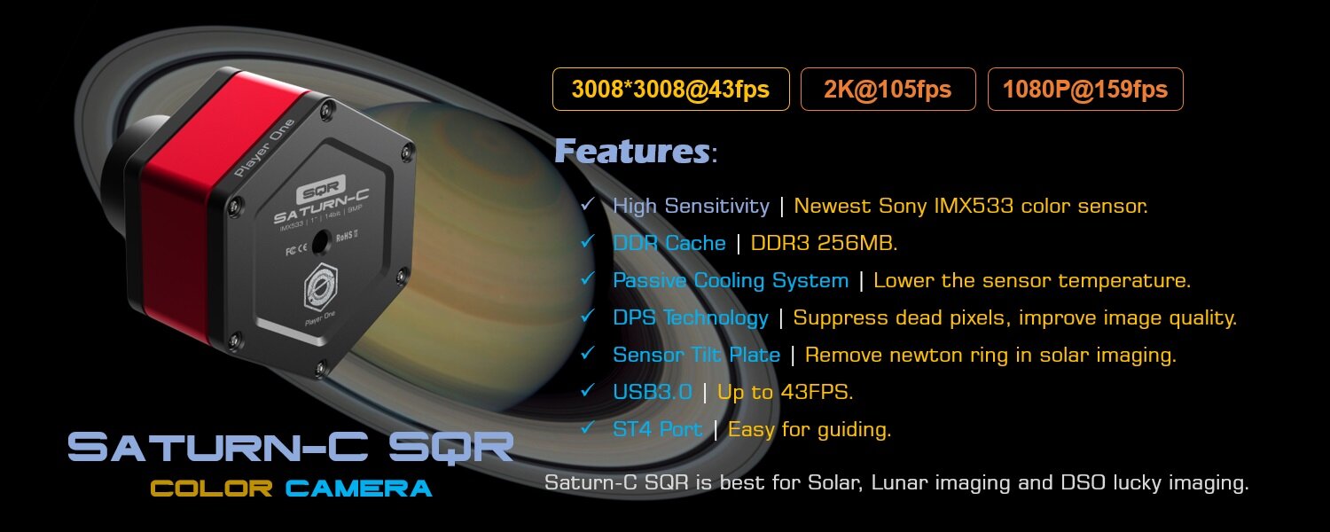 Saturn-M SQR and Saturn-C SQR is the most powerful planetary camera in our history! Based on IMX533 BSI sensor, high image quality, high resolution and square format, non-amp-glow feature, the camera will be great for lunar, solar mosaic and DSO lucky imaging.