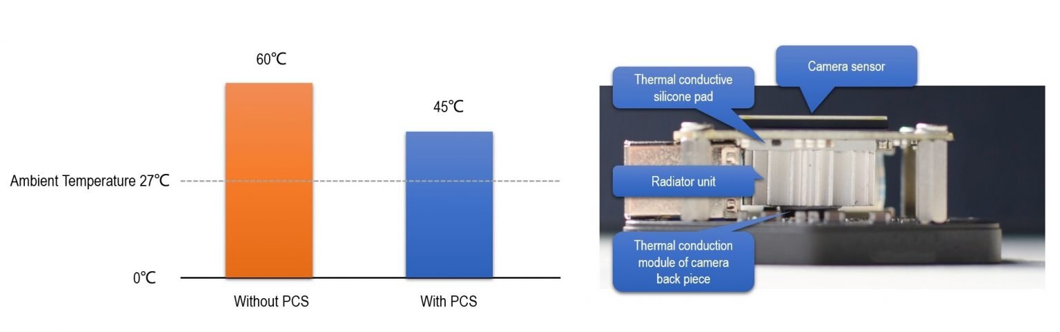 ACS can provide much better temperature control. When camera has PCS + ACS, temperature is only 7℃ higher than ambient, camera body is a little warm but won’t hot!