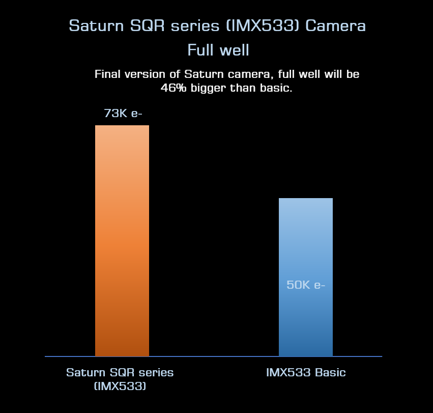 Based on our technology, we improved the full well of Saturn-M SQR camera to 73Ke , it’s almost 1.5 times than IMX533 Basic (50ke).
